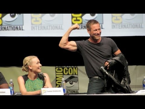 Aaron Eckhart bicep and Yvonne Strahovski I Frankenstein Comic-Con 2013 - Yvonne Strahovski Underworld - HD VIDEO - Aaron Eckhart (The Dark Knight) flexes his bicep to show he's still in shape during the I, Frankenstein Comic-Con panel when challenged by fans.